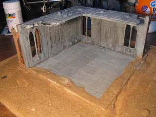 Es una base de carton de alta densidad para carteleria (si, cartonee un cartel de un negocio) y las paredes y demas estructuras son polyfan de 3cm de espesor cortado con trincheta/cutter. La idea de hecho es que quede lo mas imperfecto posible, para lo cual hice los cortes no muy derechos y poco profundos para despues terminar de despegar el polyfan a mano. El plan es luego hacer carta-pesta sobre la estructura terminada para darle textura y probablemente una mano de plasticola y arena para terminar de generar la impresion de que lo que vemos es una excavacion en roca.